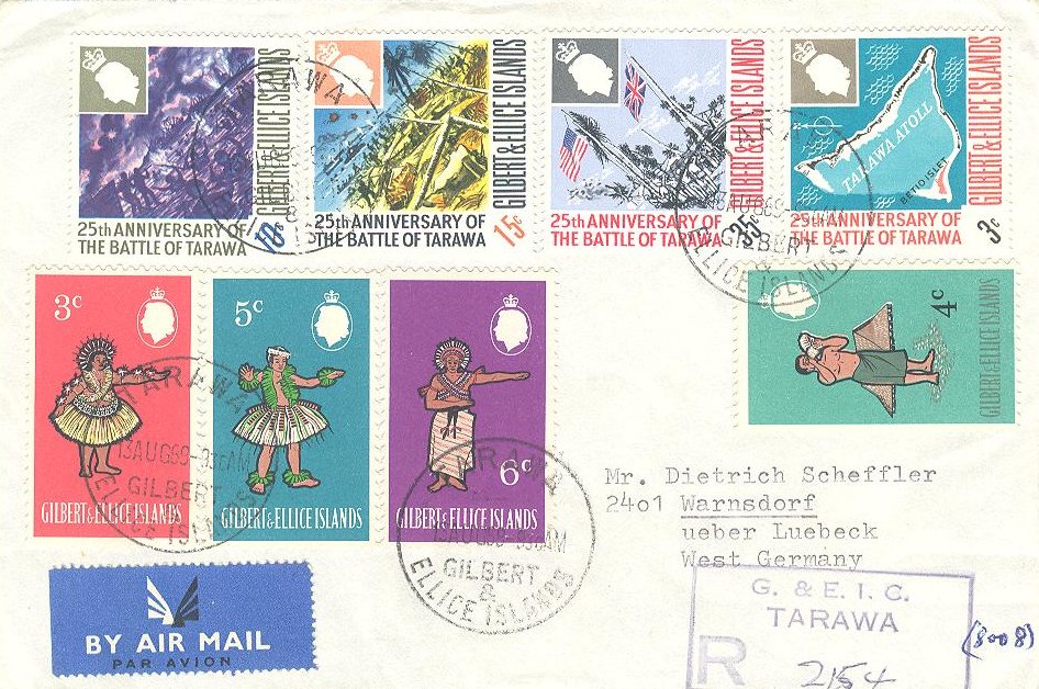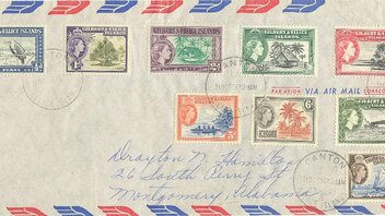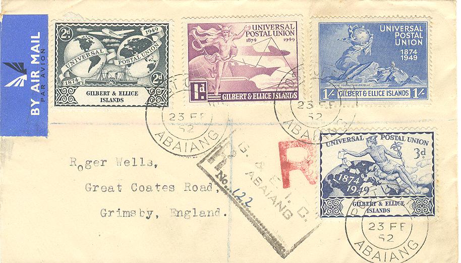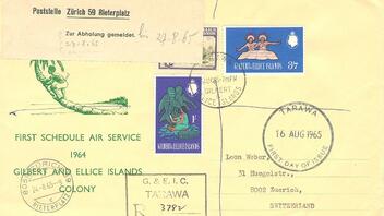 3. Da haben wir einen frankierten R-Brief von Abaiang (nördliche Gilbertinseln) nach England der beidseitig mit Marken bestückt ist (4 x 1d, 2 x 2d, 1 x 3d und 1 x 1/-). Das ergibt 1/11d. Irgendetwas stimmt jedoch nicht mit dieser Rate. Nach altem Tarif wäre es 1d, nach dem damals geltenden Tarif jedoch sogar 11d zu wenig. Irgend jemand hat da wohl geschlafen oder aber der Air Mail-Aufkleber ist Makulatur. Fragen über Fragen. Ach ja der Stempel ist ein Vernon Typ 28 (Abaiang / 23.02.1952).