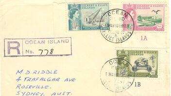 2. Ein Registrierter Erstagsbrief (Cachet) nach Australien mit 1Sh 6d frankiert. Der Brief könnte sogar portogerecht sein (3d Einschreibegebühr / 1/3d Luftpost nach Australien). Ich habe jedoch lediglich den geltenden Luftposttarif von Canton Island nach Australien zur Hand und kann nicht genau sagen ob auf Ocean Island damals der selbe Tarif galt. Eine kleine Notiz oben links "Air Mail via N.Z." könnte suggerieren das der Brief über Canton Island gelaufen ist. Ein Transitstempel auf der Rückseite der eine Klärung bringen könnte fehlt jedoch. Das macht mich ein wenig unsicher. Naja befassen wir uns mit den Stempeln. Wir haben da einen Vernon Typ 34 (Ocean Island / 10.11.1949) und einen R-Stempel (Typ R10 / Ocean Island).