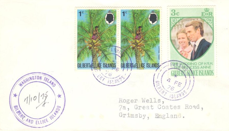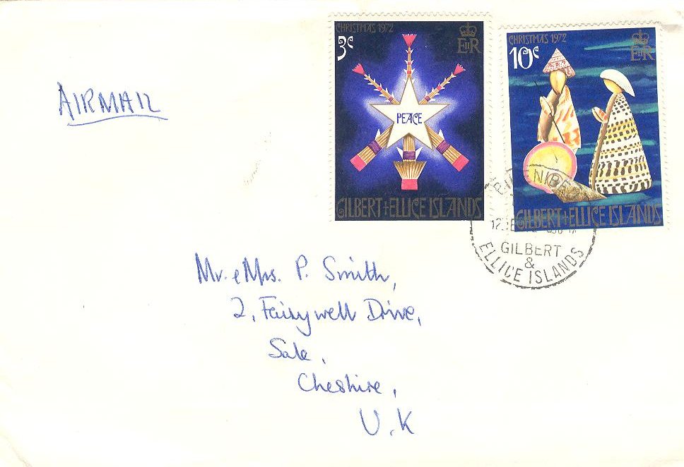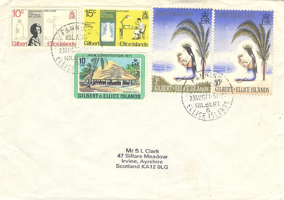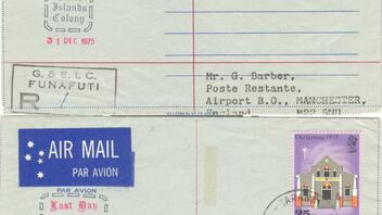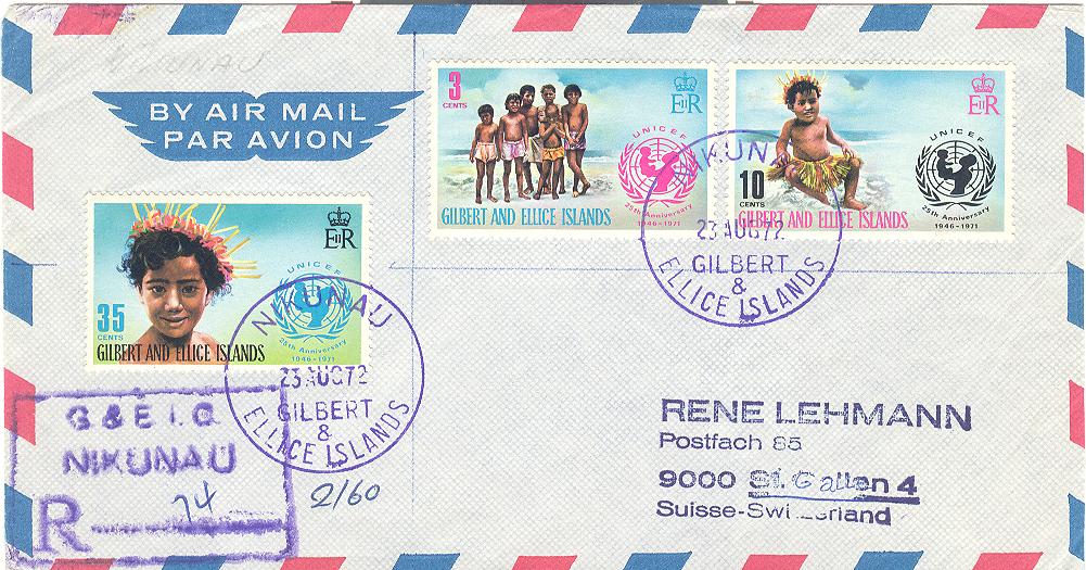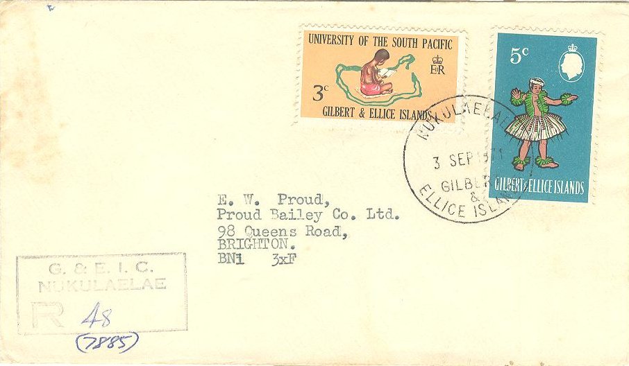 2. Ein R-Brief von Nukulaelae (Ellice Inseln) nach Großbritannien der portogerecht mit 8c frankiert ist. Hier finden wir den 3c-Wert (Michel 149) in Mischfrankatur mit dem neuen Freimarkenwert zu 5c (Michel 134). Abgestempelt sind die Marken mit einem Stempel Typ Vernon 66 Nukulaelae 03.09.1971). Außerdem findet man noch einen R-Stempel R25 (Nukulaelae) auf dem Brief.