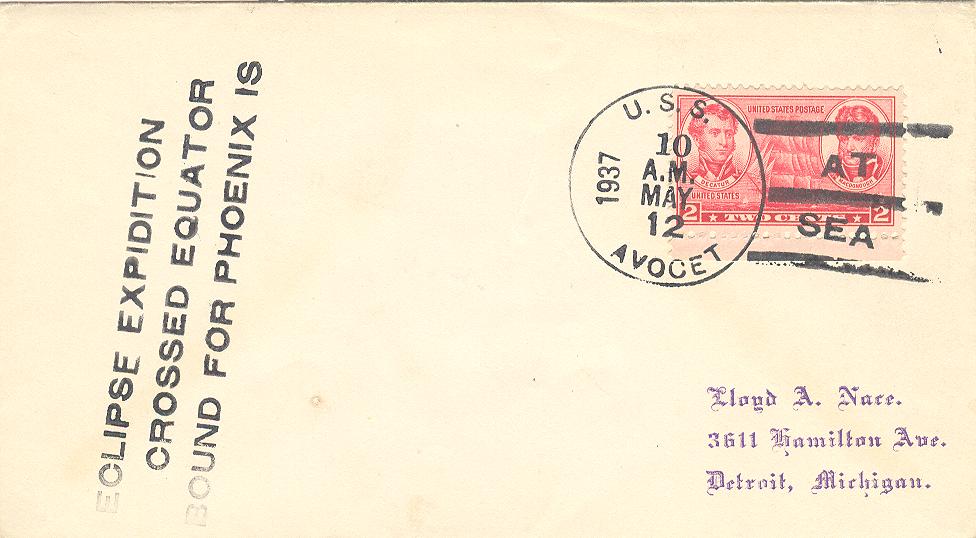 1. Ein Brief mit Schiffsstempel der USS Avocet vom 12. Mai 1937. Zwischen den Balken rechts des Stempels befindet sich der Aufdruck „AT SEA“. Der Umschlag hat das Cachet “ECLIPSE EXPEDITION CROSSED EQUATOR BOUND FOR PHOENIX IS” und dokumentiert damit die Überquerung des Äquators auf den Weg zum Expeditionsziel, den Phoenixinseln.