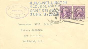 4. Der Brief trägt den blauen Aufdruck „H.M.S. Wellington N.Z. Solar Expedition Canton Island June 8 th 1937“ und einen ovalen Handstempelaufdruck (violett) „N.Z. Solar Eclipse Expedition Phoenix Islands 1937“. Für den postalischen Weitertransport bediente man sich jedoch US-amerikanischer Hilfe. Neben den benutzten US-Marken wurde auch der Schiffsstempel der USS Avocet vom 08. Juni 1937 abgeschlagen. Zwischen den Streifen rechts, des Stempels, befindet sich der Aufdruck „Canton Island“. Im Gegensatz zu anderen Briefen ist dieser jedoch um 8*38 gestempelt. Diese Uhrzeit steht für das Ende