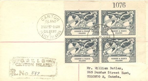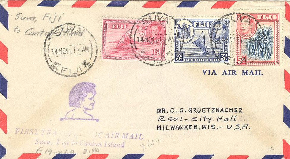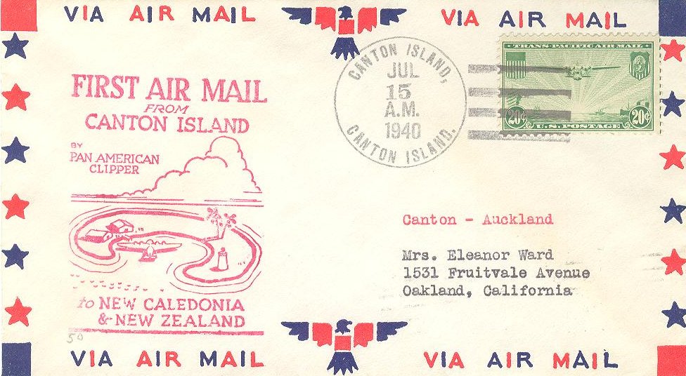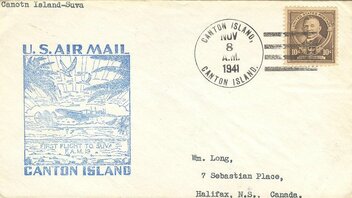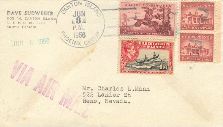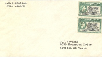 Einige Tage später erreichte man die erste der Phoenixinseln (Enderbury). Es gibt Briefe die dieses Ereignis mit dem Datum vom 24. Mai 1937 dokumentieren. Ähnlich wie bei dem ersten gezeigten Brief wurde ein Aufdruck "ENDERBURY ISL" zwischen den Balken rechts des Stempels eingefügt. Leider kann ich solch einen Brief noch nicht zeigen. Die Expedition hatte neben der Beobachtung der Sonnenfinsternis auch die Aufgabe geeignete Landeplätze für eine transpazifische Flugverbindung zwischen Hawaii und Neuseeland zu finden. Deshalb wurde Enderbury Island neben Canton Island ein Besuch abgestattet.