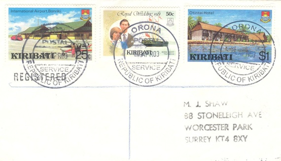 Wir sind jetzt also noch immer bei den Phoenixinseln. Der 12.07.1979 ist ein Schlüsseldatum für die Inselgruppe. Von diesem Datum an gehörte die Inselgruppe zum neuen unabhängigen Staat mit dem schönen Namen Kiribati. Damit ging auch die Posthoheit auf das neu gegründete Land über. Die letzte Post Office , die amerikanische PO auf Canton Island wurde geschlossen und eine neue PO, die von Kiribati wurde eröffnet. Nicht nur das änderte sich, auch die Namen der Inseln wurden verändert. So hieß Canton Island künftig Abariringa, später auch Kanton und z.B. Hull Island wurde in Orona umbenannt. Damit wurde, denke ich, der neu gewonnenen Identität des gerade gegründeten Nationalstaates genüge getan. Aus der Bedeutungslosigkeit konnte das die Inselgruppe jedoch nicht holen. So lebten im Jahre 2005 laut Wikipedia gerade einmal 41 Personen auf Canton Island. Canton Island ist damit die einzige permanent bewohnte Insel der Phoenixgruppe. Postalisch sieht es damit auch nicht gerade rosig aus. Besonders Briefe aus den 1990-iger Jahren sind rar. Es gibt Berichte die von Ungereimtheiten bei der Post Office zu dieser Zeit berichten. Dem ungeachtet sind bis heute wenigstens zwei Stempeltypen in Verwendung gewesen. Leider kann ich nur einen zeigen. Soweit also zu Canton Island, doch Wunder auch eine andere Insel der Phoenixgruppe hat mittlerweile wieder einen Poststempel! Seit der Jahrtausendwende führt auch Orona (vormals Hull Island) wieder einen Poststempel. Wie das möglich ist, die Insel ist ja bekanntlich unbewohnt, hier ein Erklärungsversuch. Kokospalmen sind auf der Insel spätestens seit den ersten Besiedlungsversuchen in den 1930-iger Jahren nicht unbekannt. Ich gehe davon aus das es mittlerweile wieder so etwas wie eine Plantage gibt. Geerntet muss auch werden und so könnte ich mir vorstellen das zur Erntezeit ein Postamt in Betrieb ist. Angeblich soll kein Versand von R-Briefen von Orona aus möglich sein. Das würde auch erklären das es nur eine provisorische PO mit eingeschränkten Dienstleistungen gibt. Soweit mein Erklärungsversuch. Wenn jemand da vielleicht andere Erkenntnisse hat bin ich für Infos immer dankbar. Im Jahre 2006 wurden die Phoenixinseln und das angrenzende Meeresgebiet durch Kiribati zum Schutzgebiet Phoenix Islands Protected Area (PIPA) erklärt. Im Jahre 2008 wurde das Gebiet erweitert (auf 410000 qkm) und 2010 durch die UNESCO zum Weltnaturerbe erklärt. Vielleicht gibt ja diese Entscheidung dem Gebiet neue Impulse (z.B. sanfter Tourismus, Verbesserung der Infrastruktur). Hübsche neue Briefmarken (durch Kiribati) wurden auf jeden Fall schon aufgelegt. Zeit etwas zu zeigen: