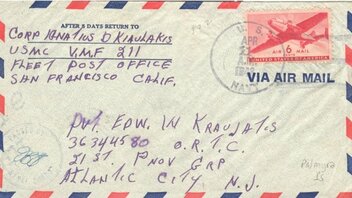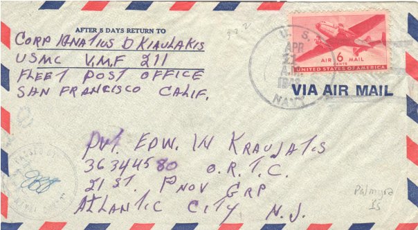 Ein zensierter Brief von Palmyra Island (Passed BY Navy Censor) vom 1st Def. Bn. Navy 309 (11.04.1943) nach den USA mit 6c portogerecht frankiert. Die U.S. Navy war von 1942 bis Ende 1947 auf der Insel stationiert.