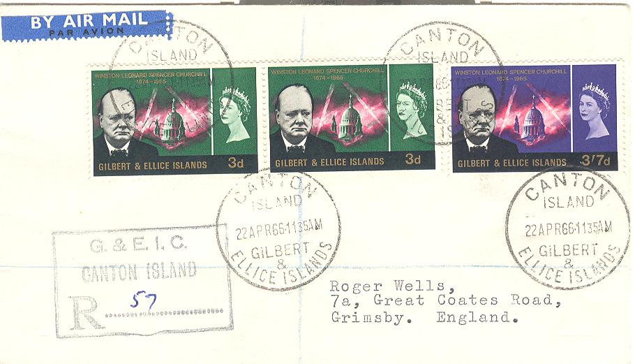3. Da haben wir einen frankierten R-Brief von Abaiang (nördliche Gilbertinseln) nach England der beidseitig mit Marken bestückt ist (4 x 1d, 2 x 2d, 1 x 3d und 1 x 1/-). Das ergibt 1/11d. Irgendetwas stimmt jedoch nicht mit dieser Rate. Nach altem Tarif wäre es 1d, nach dem damals geltenden Tarif jedoch sogar 11d zu wenig. Irgend jemand hat da wohl geschlafen oder aber der Air Mail-Aufkleber ist Makulatur. Fragen über Fragen. Ach ja der Stempel ist ein Vernon Typ 28 (Abaiang / 23.02.1952).
