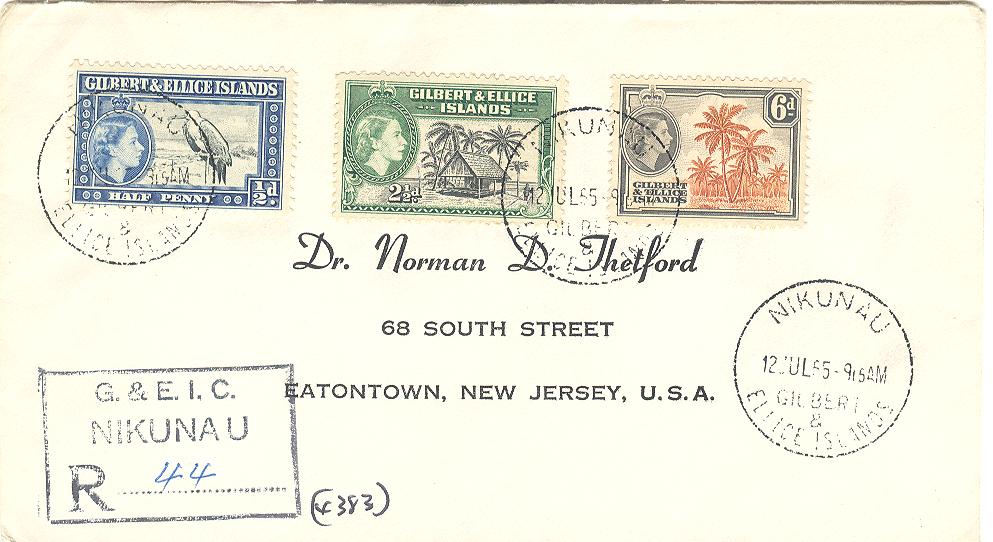 3. Da haben wir einen frankierten R-Brief von Abaiang (nördliche Gilbertinseln) nach England der beidseitig mit Marken bestückt ist (4 x 1d, 2 x 2d, 1 x 3d und 1 x 1/-). Das ergibt 1/11d. Irgendetwas stimmt jedoch nicht mit dieser Rate. Nach altem Tarif wäre es 1d, nach dem damals geltenden Tarif jedoch sogar 11d zu wenig. Irgend jemand hat da wohl geschlafen oder aber der Air Mail-Aufkleber ist Makulatur. Fragen über Fragen. Ach ja der Stempel ist ein Vernon Typ 28 (Abaiang / 23.02.1952).
