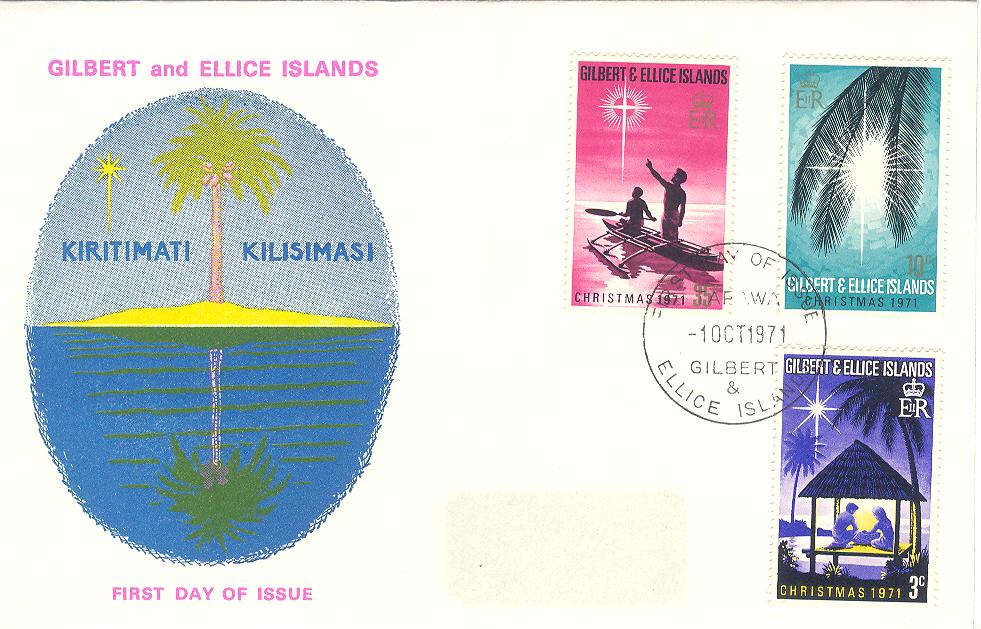 3. Die Weihnachtsausgabe auf FDC abgestempelt mit einem Vernon Typ 65 (Tarawa - 22.09.1975).