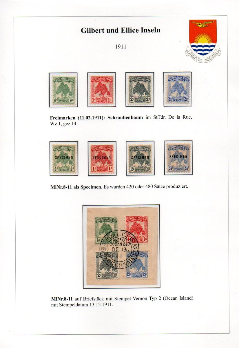 Nukufetau ist ein fast rechteckiges Atoll mit einer Gesamtfläche von 116 qkm. Jedoch sind nur knapp 3 qkm tatsächlich Landfläche. In den 1960-er Jahren lebten ca. 900 Einwohner auf der Insel die laut mündlicher Überlieferung wohl von den Tonga Inseln aus besiedelt wurde. Offiziell gesichtet wurde das Atoll im Jahre 1819 durch De Peyster (Schiff „Rebecca“) auf einer Reise von Valparaiso nach Kalkutta. Es wird jedoch angenommen das das Atoll bereits im Jahre 1568 durch den Spanier Mendana gesichtet wurde. Die Aufzeichnungen dazu sind jedoch nicht eindeutig. Um die Jahre 1863-64 waren peruanische Sklavenhändler im Atoll aktiv. Sie konnten jedoch nur 3 Einheimische verschleppen wovon 2 später auch noch die Flucht gelang. Ab 1865 waren samoanische Missionare aktiv die zwei Jahre später auch die erste Kirche errichteten. Im 2. Weltkrieg kamen die Amerikaner auf das Atoll. Sie errichteten ein Flugfeld und einen Anleger und nutzten das Atoll als Sprungbrett für die Schlacht um Tarawa im November 1943. Danach wurde es wieder ruhig und das Flugfeld wurde aufgegeben. Ein genaues Datum wann die erste Post Office auf dem Atoll öffnete ist nicht bekannt. Es soll aber um etwa 1920 losgegangen sein. Wirklich belegt sind erste Abstempelungen ab 1925. Seitdem wurden vier Stempeltypen benutzt. Auch drei R-Stempel waren in Benutzung wobei hier auch die Registrierung mittels Manuscript im Jahre 1946 bekannt ist. Auch die US Navy (Naval PO 333) war kurz mit einem Stempel in Nukufetau aktiv (1943).