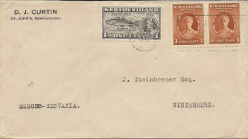 Zum anderen zeige ich aus der Steinbrenner-Korrespondenz einen Auslandsbrief (korrekt mit 7c frankiert) mit der 1c Long Coronation Issue und zwei 3c Marken der Ressources Issue von St. John's nach Winterberg in der Tschechoslowakei aus dem Jahr 1938.