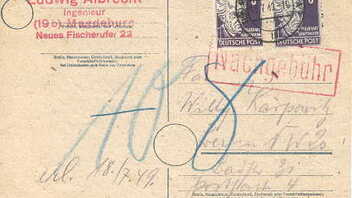 Postkarte während der Zeit der Westberliner Nachgebührenreduzierung für SBZ-Marken gelaufen. ab dem 14.6.49 wurden in Westberlin alle SBZ-Marken und entsprechende Sendungen mit Nachgebühr belegt.
