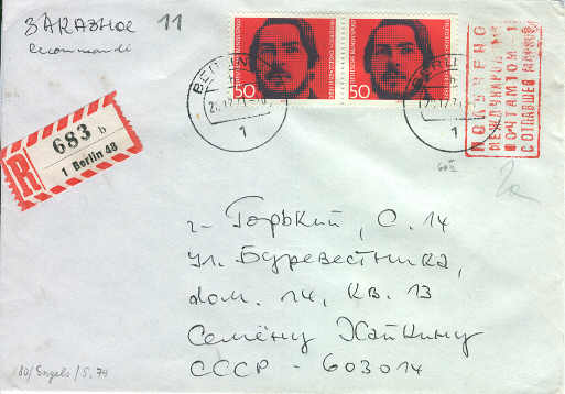 BRD-UdSSR - Eine unliebsame Marke entfernt und dafür Fehlstempel angebracht. Allerdings im Jahre 1971 eigentlich so nicht mehr üblich, sondern es wurden Briefe mit unliebsamen Marken eigentlich zurückgeschickt. Die Ausnahme wurde gemacht, da eine (hier zwei) Marken mit Friedrich Engels auf dem Brief. Ein "kommunistischer Held" auf einer "kapitalistischen" Briefmarke, solche Brief "musste" man einfach durchlassen