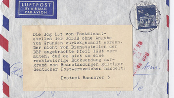 Beim Versuch, einen Brief von Hamburg in die LSSR (Litauen) zu senden, beanstandete die Soviet-Post die Briefmarke "Brandenburger Tor" MiNr. 509. Die Darstellung des Brandenburger Tors ohne Mauer, und aus Blickrichtung Ost-Berlins provozierte die dortigen Behörden, dieses "gültige deutsche Postwertzeichen" zu beanstanden.