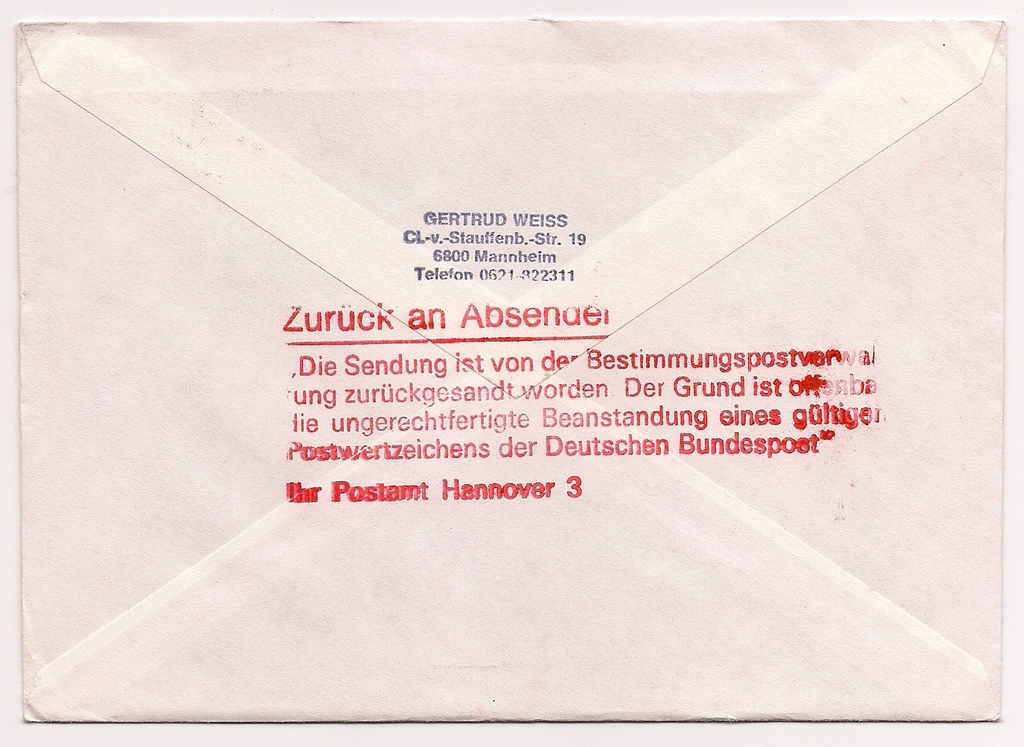Als Erklärung wurde die Sendung mit einem Zettel des Postamt Hannover 3 versehen, quasi als "Retourkutsche" ;)