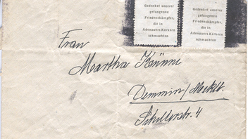 Hier ein Brief mit 2x Kriegsgefangenengedenkmarke in die DDR. Marken geschwärzt und dann mit Adenauer-Vignette überklebt.