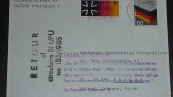 4. Brief in einen ehemaligen Staat des Ostblocks mit "unliebsamen" Postwertzeichen, der deshalb vom Bestimmungsland Polen nicht angenommen wurde. Diese Verweigerung der Annahme wurde mittels Stempel auf dem Brief versehen.