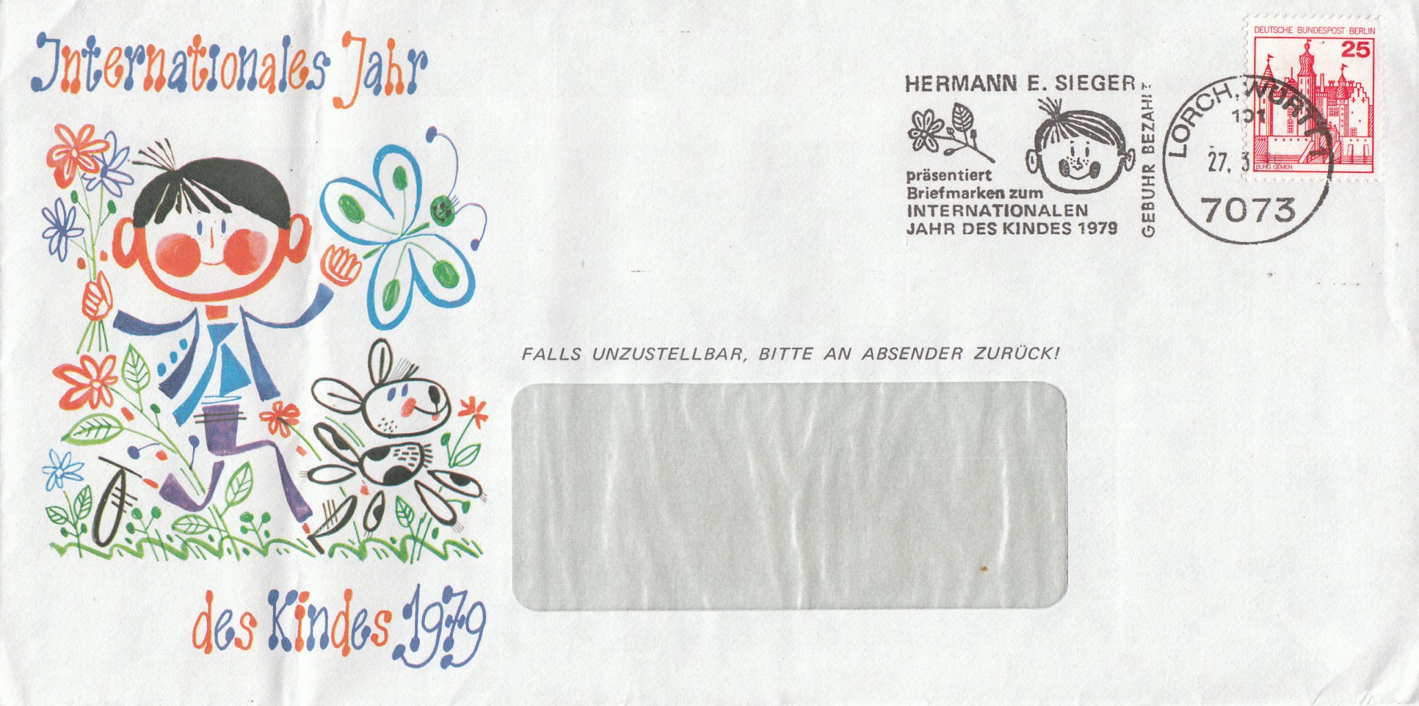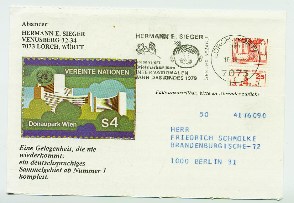 Einmal mehr inspiriert von dem Beleg mit Werbeeinsatz zum INTERNATIONALEN JAHR DES KINDES 1979 hier ein am 27.3.79 mit der Maschine 101 in 7073 LORCH gestempelter Beleg mit passender Werbung auf dem Umschlag, leider in diesem Falle ohne Einlage mit Adresse des Empfängers, aber immerhin mit Berlin-Frankatur 25 Pf B&S.