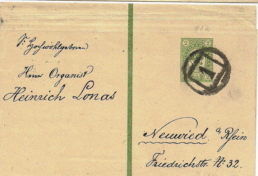 Außerdem zeige ich eine 4 Kopeken Ganzsachenpostkarte (Ascher Nr. 11) nach Rüggeberg in Westfalen. Hier ist nur der schwarze K2-Stempel von St. Petersburg 5 vorderseitig abgeschlagen.