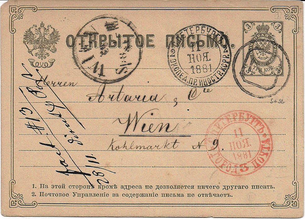 Die 3 Kopeken Ganzsachenkarte ( Inschrift: Offener Brief; Ascher Nr. 5) wurde am 11. November 1881 (Julianischer Kalender) in St. Petersburg nach Wien aufgegeben. Das Ankunftsdatum des Wiener K1-Stempels kann ich leider nicht entziffern, die rückseitige Bestellung von Stadtansichten wurden aber offenbar am 28.11. bearbeitet (hs. Vermerk auf der Kartenvorderseite links).