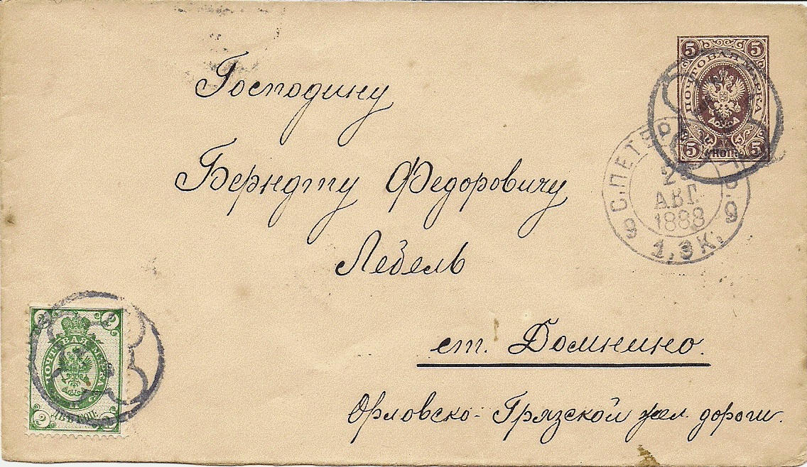 Hier handelt es sich um einen 5 Kop. Ganzsachenumschlag mit 2 Kop. Zusatzfrankatur aus St. Petersburg nach Domnino.