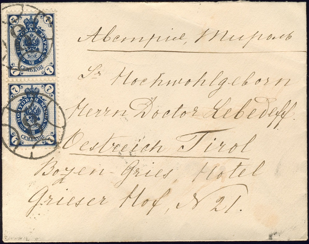 Ein senkrechtes Paar 7 Kop. von 1895 nach Österreich. Die entwertung erfolgte mit dem Nummernstempel "8".