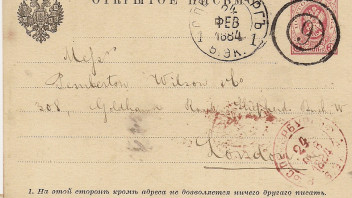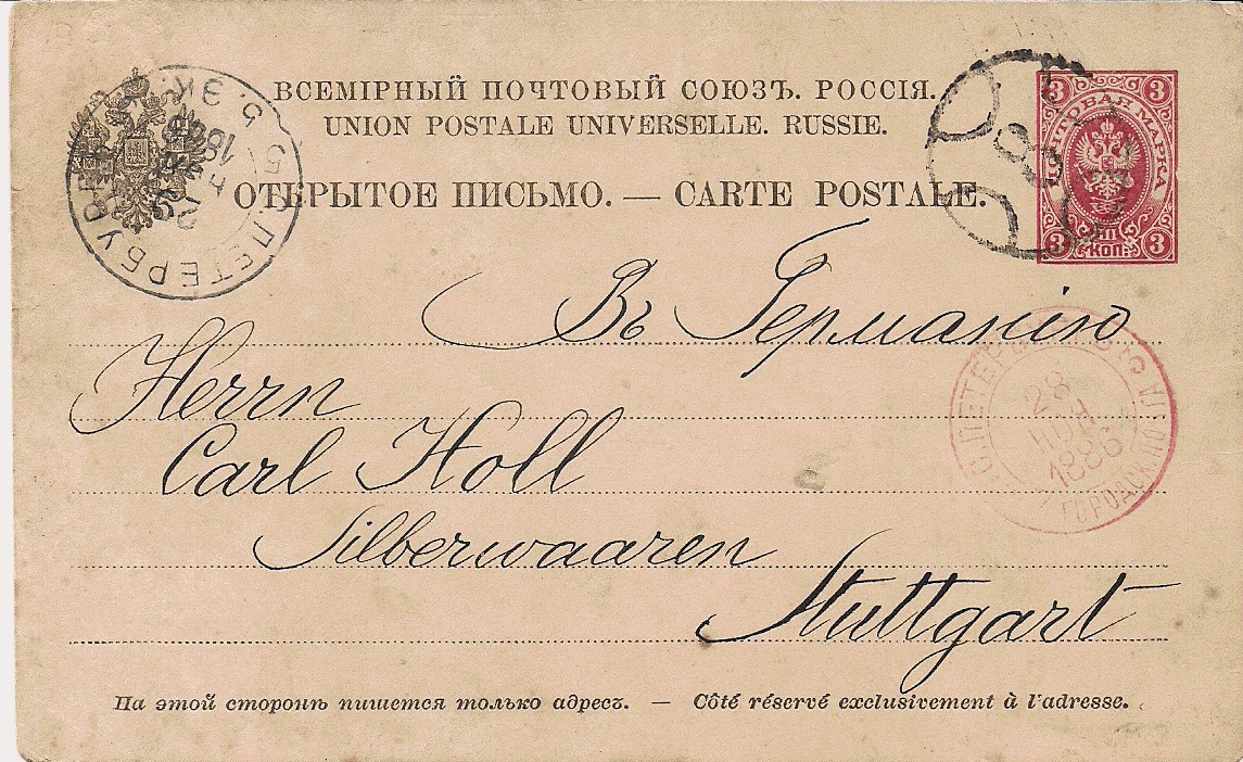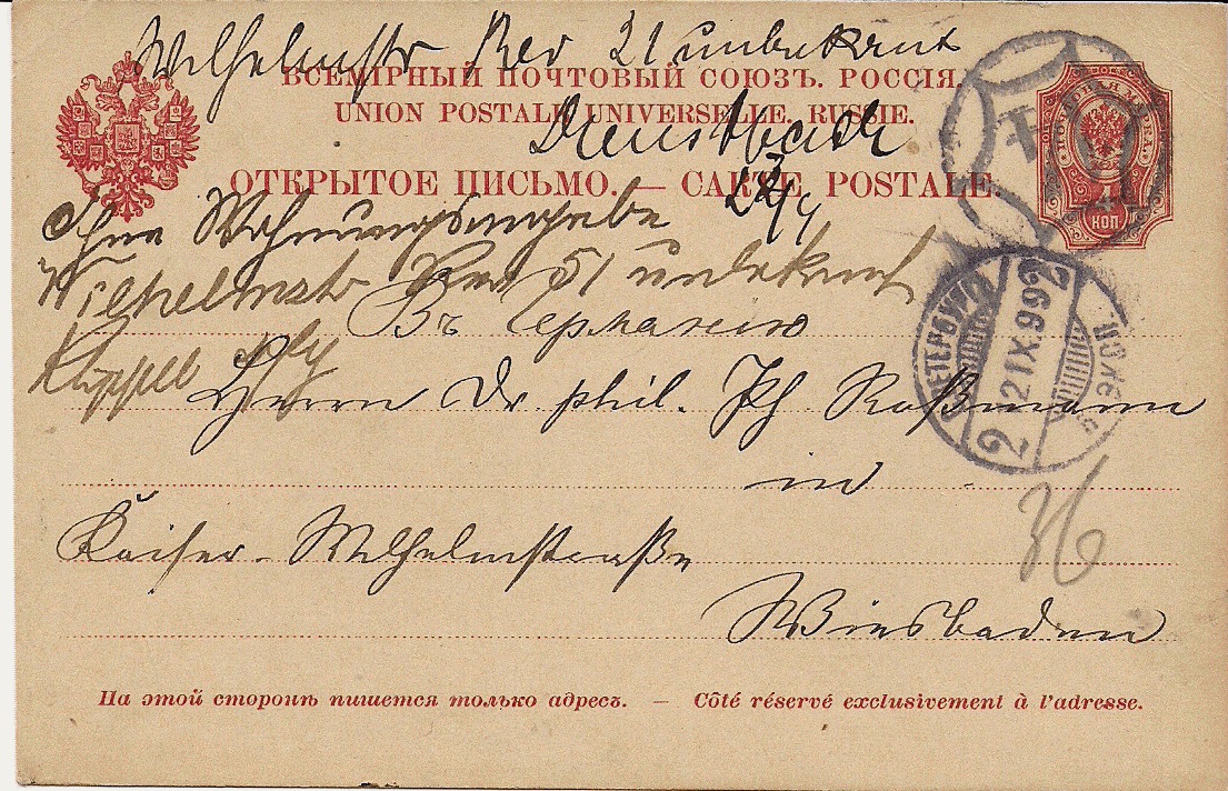 Abgangsstempel St. Petersburg 25. September 1889 (der zweite 8er scheint kopfüber eingesetzt zu sein). Nach gregorianischem Kalender (+12 Tage = 7. Oktober 89) also 46 Tage Laufzeit!