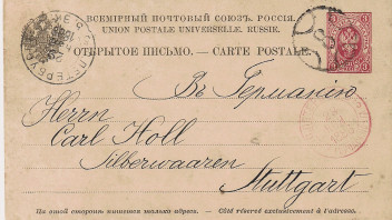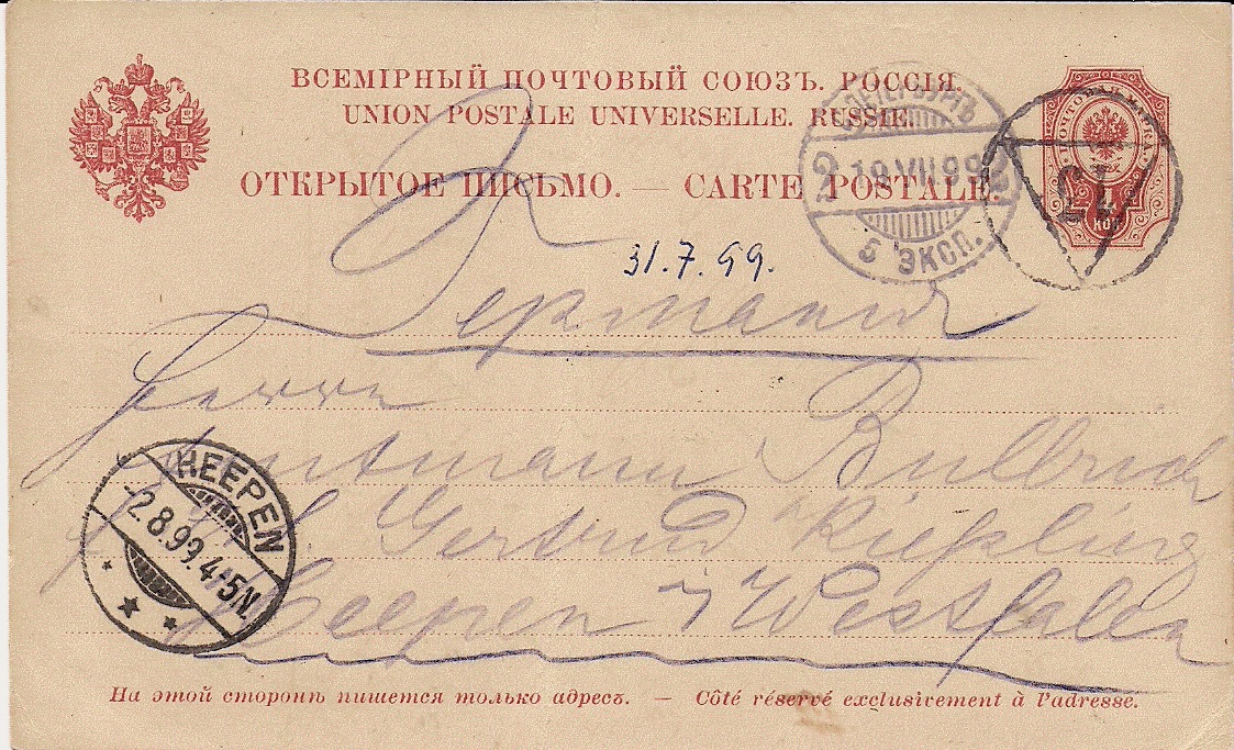 Meine Neuerwerbung, eine 4 Kop. Ganzsachenpostkarte, wurde am 19.7.1899 (jul. Kalender) nach Heepen in Westfalen geschickt. Dort kam sie am 2.8.1899 (greg. Kalender) an. Heepen ist seit 1973 ein Ortsteil Bielefelds.