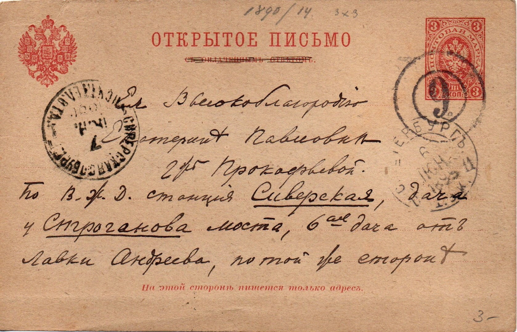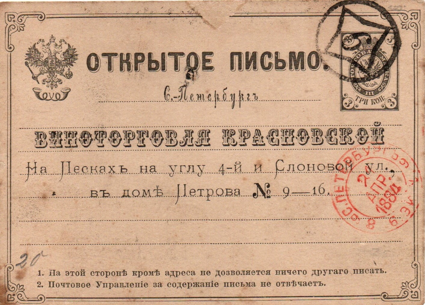 Hier nun die 3kop Ganzsachenkarte aus St. Petersburg, mit dem Stempel der Stadtpostabteilung 6 entwertet und darunter der rote Datumstempel der 9. Expedition. Der Nummernstempel scheint mir die schlanke Type nach Dobin/Ratner zu sein.