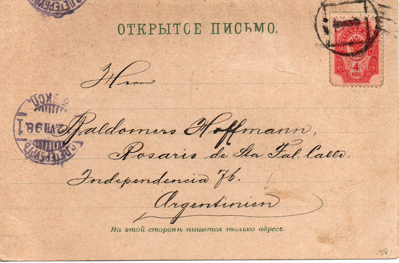 • St. Petersburg, Stadtpostabteilungen, Nr. 1 auf Postkarte nach Argentinien, 1898.jpg