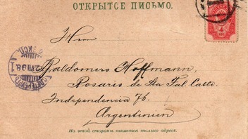 Die übrigens in deutsch geschriebene Ansichtskarte wurde am 12.VII 98 (jul. Kal.) in Sankt Petersburg abgestempelt. Leider kein Ankunftstempel von Rosario, aber eine handschriftliche Notiz auf der Bildseite: empf. 22/9 98 (greg. Kal.). Der 12.7. (jul.) entsprach dem 24.7. (greg.) Demzufolge wäre die Karte 60 Tage unterwegs gewesen.