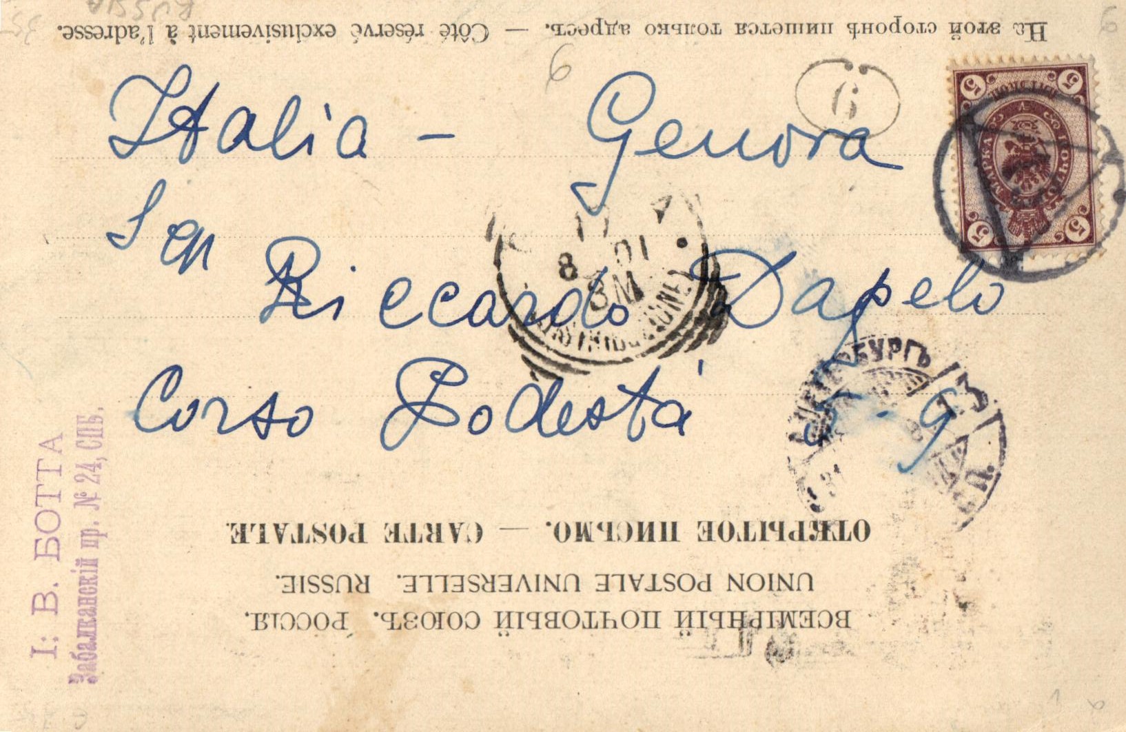 Die übrigens in deutsch geschriebene Ansichtskarte wurde am 12.VII 98 (jul. Kal.) in Sankt Petersburg abgestempelt. Leider kein Ankunftstempel von Rosario, aber eine handschriftliche Notiz auf der Bildseite: empf. 22/9 98 (greg. Kal.). Der 12.7. (jul.) entsprach dem 24.7. (greg.) Demzufolge wäre die Karte 60 Tage unterwegs gewesen.