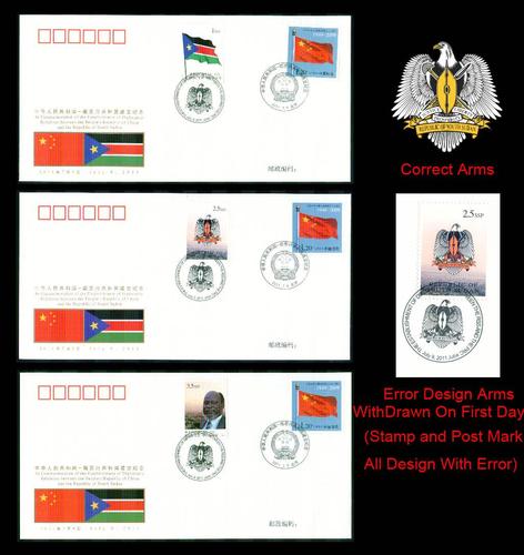 China Diplomatic Relations with South Sudan FDC Error Design in Arms with Stamp & Cancle 300 Sets Issued, RARE MNH