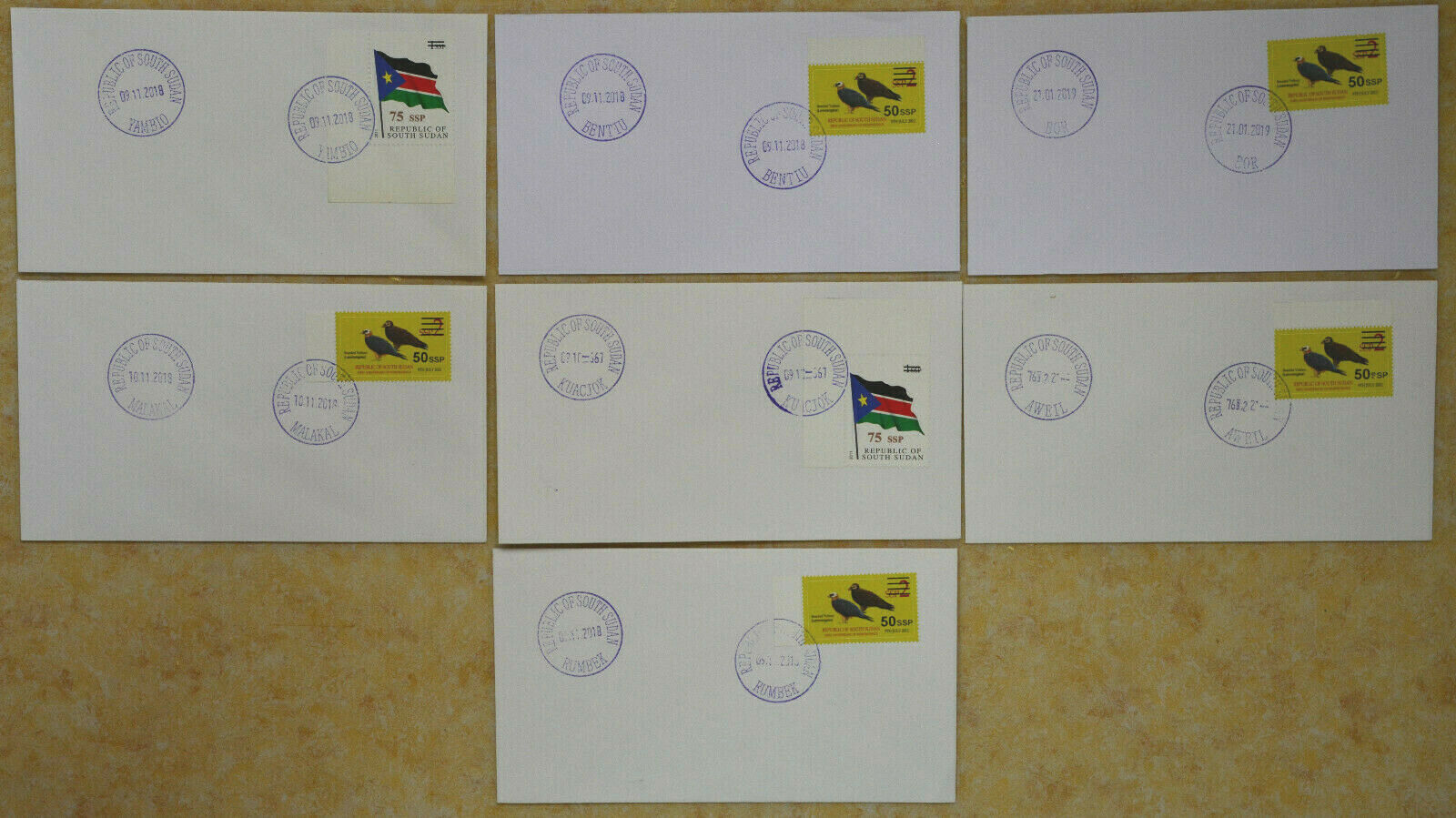 Angeblich wurden diese Stempel in China hergestellt, das schon die meisten Briefmarken vom Südsudan fabriziert hat. Diese Stempel wurden zur Unabhängigkeit des Südsudans hergestellt. Diese Postämter wurden aber nie eröffnet oder stellten ihren Betrieb ca. 2013 wieder ein, bevor die Stempel aus China geliefert wurden. Sie sollen dann im Postamt zu Juba achiviert worden sein. Die Beschreibung des Händlers lautet wie folgt: