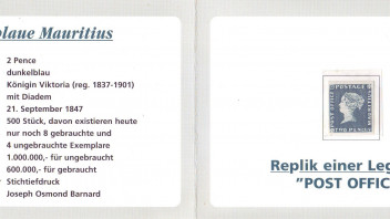 Als absolute Sensation bezeichnet der Verkäufer hier seine "Blaue Mauritius", die natürlich nicht die falsche Inschrift "Post Office" trägt, sondern nur die richtige "Post Paid".