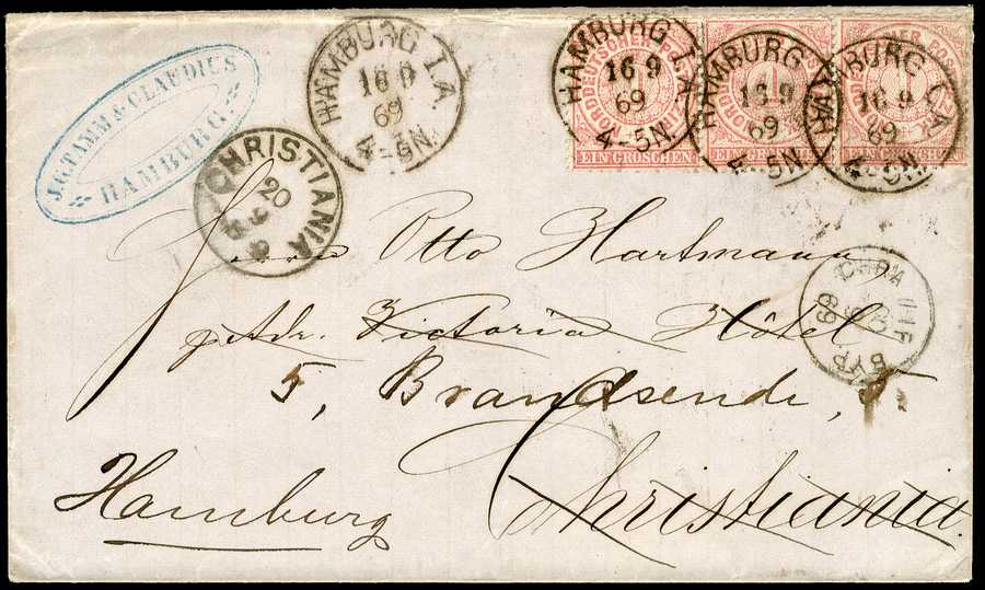 Soll das jetzt heissen: Ein Brief mit dieser Marke wurde nach Christiania (früherer Name für Oslo), versandt. Da die Marke im NDP versehentlich nicht abgestempelt wurde, haben die Norweger nach Einlaufen des Schiffes die Marke mit ihrem Stempel nachträglich entwertet? War das früher um 1868 denn so üblich und soll der Stempel deshalb so selten sein?