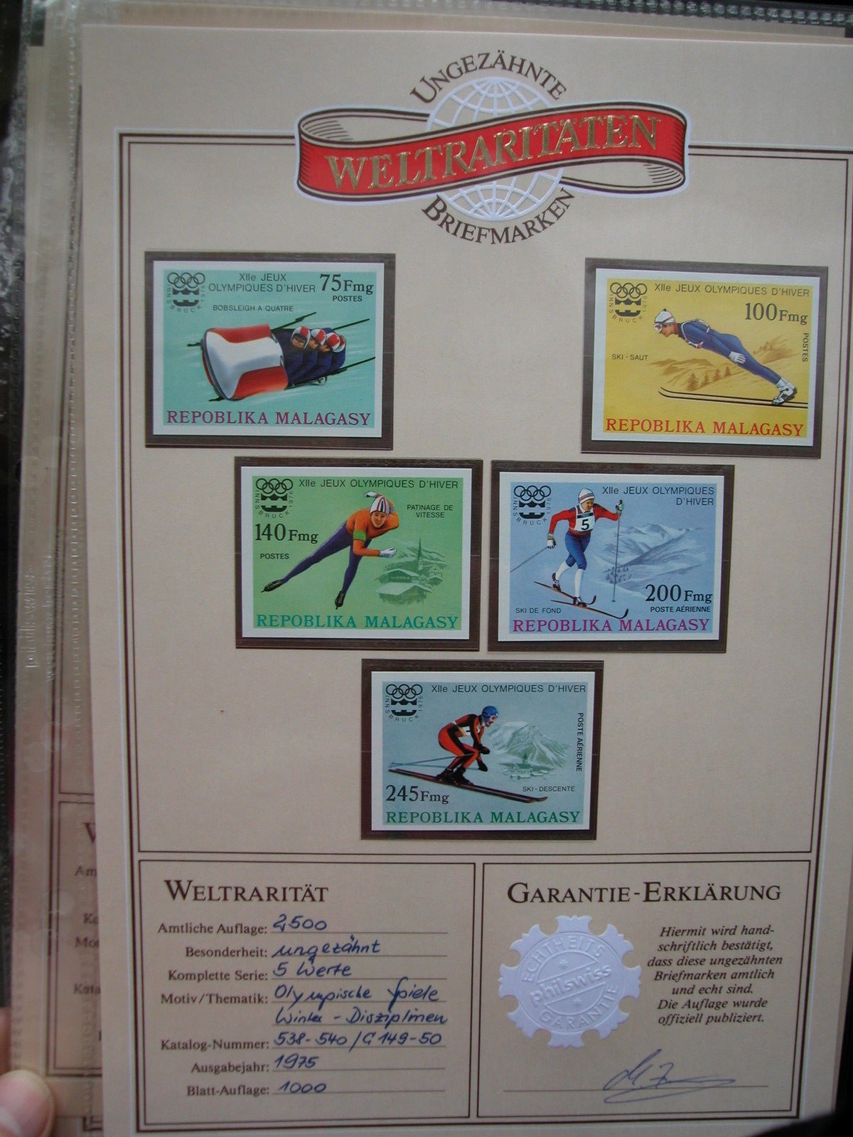 Wie mit dem Begriff "Weltrarität" Schindluder betrieben wird, zeigt dieses Angebot von 6 ungezähnten Marken aus Madagaskar zur Olympiade 1976 für läppische 7,- EUR im Sofortkauf. Auf einem typischen Albumblatt der Schweizer Firma Philswiss, die vor einigen Jahren eine Menge Schrott-Motiv-Marken teuer an die armen Sammler verscherbelte und die heute nur noch einen Bruchteil der Abosummen bei einem Weiterverkauf bringen.
