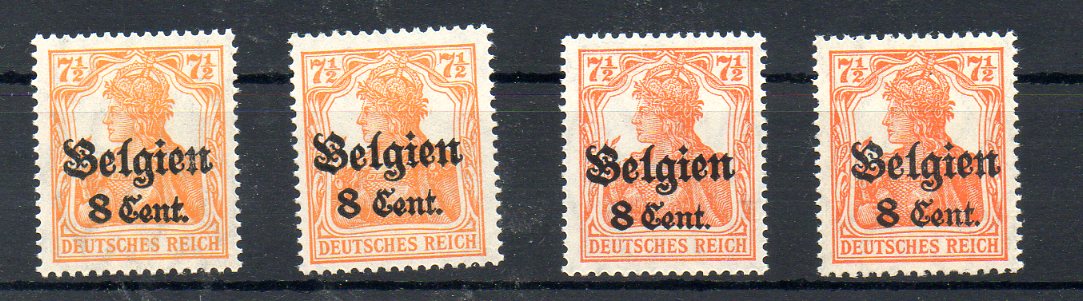 Wie du am Bespiel meiner Marken der Besetzung 1. Weltkrieg (hier Besetzung Belgien) sehen kannst, gibt es von der Marke vier verschiedene Farbtypen. Ich hoffe, der Scanner bringt sie rüber. Drei dieser Typen der Germania-Urmarken tauchen auch im Saarland auf. Teuer sind sie in ider Type I (die hier vorliegt) alle nicht. Zwischen 1,30 und 8,00 EUR.