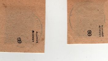 Ich habe auch mal mit meinem neuen Wissen die schon hier abgebildeten Marken noch einmal in Augenschein genommen und die sind definitiv nicht alle Type I. Die zwei Marken übereinander (hängen als Bild dran) zum Beispiel haben unten einen Strich. Demnach sind es im Schlimmstenfall Type III. Die geben mir aber auch Rätsel auf, denn wie im Bild zu sehen ist die obere Schrift kürzer wie die Untere. Kann es denn sein das zwei Marken von einem Block einmal Type II und einmal Type III sind?