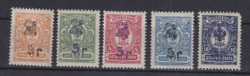 Was ich in meinem alten Katalog nicht fand, war die Überdruckmarke 5 Rubel auf 1 Kopeke orange mit Monogramm (Hoheitszeichen) vom zweiten Bild. Vielleicht ist sie in einem neuen Katalog jetzt mit aufgeführt?