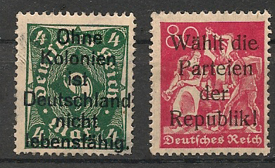 Sehr bekannt sind die Propagandaufdrucke zu den verlorenen Kolonien.