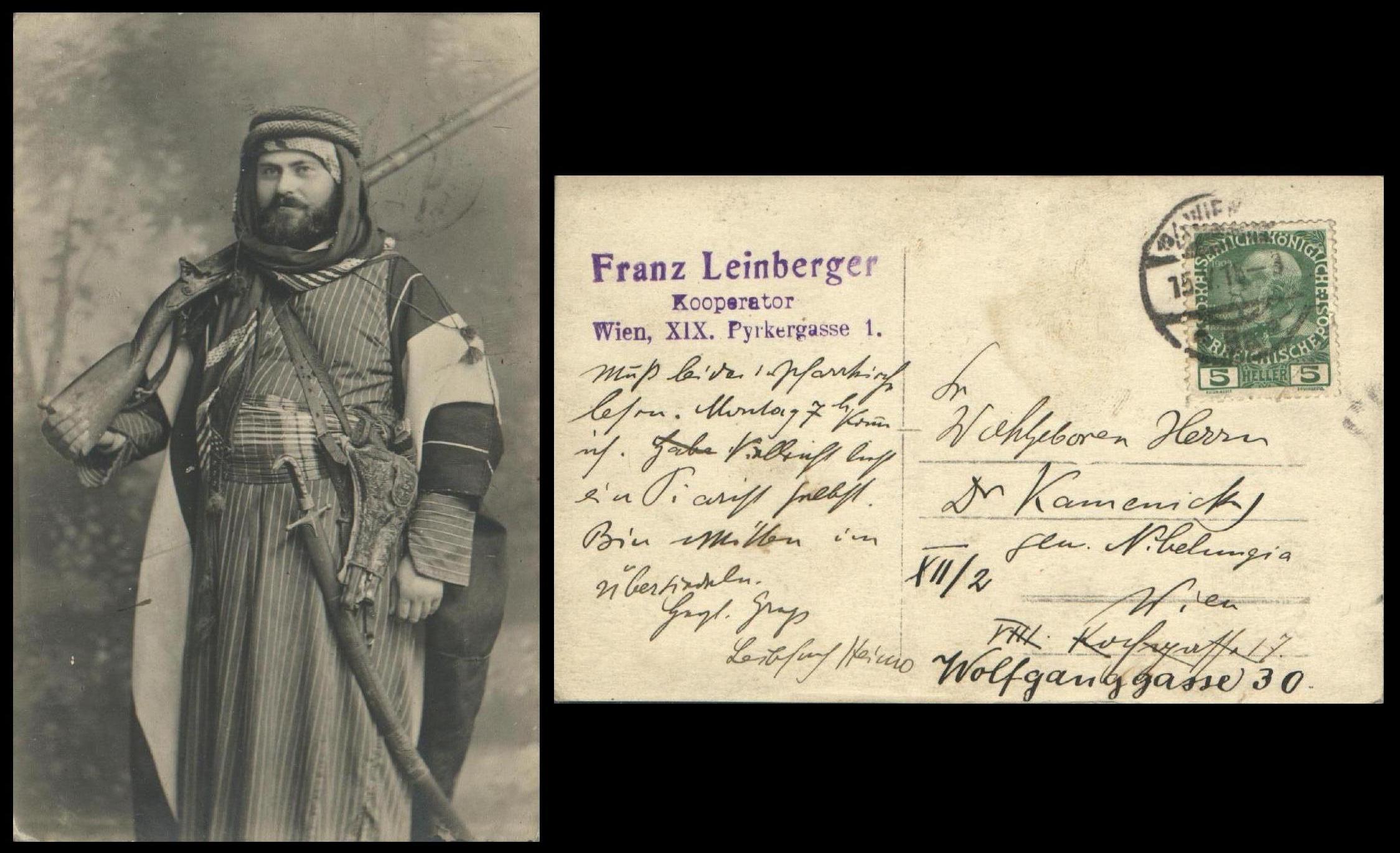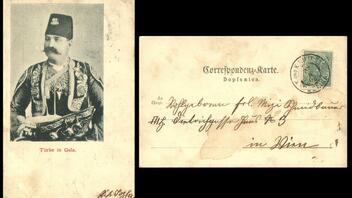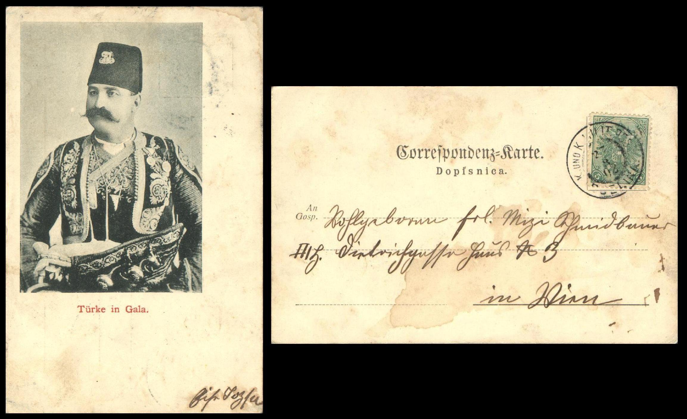 Mann in Türkentracht, vermutlich eine gestellte Aufnahme, sein Schnauzer hängt auf einer Seite runter.