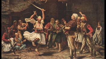 Albaner in NationalTracht. Bei der vorderen Steinschloßpistole fehlt der kugelförmige Abschluß des Griffes, die Ausnehmung ist gut sichtbar.