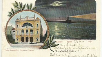 Eine Litho aus dem Jahre 1898 mit verschiedenen Trachten von Dalmatien, links die Sphynx von Split: