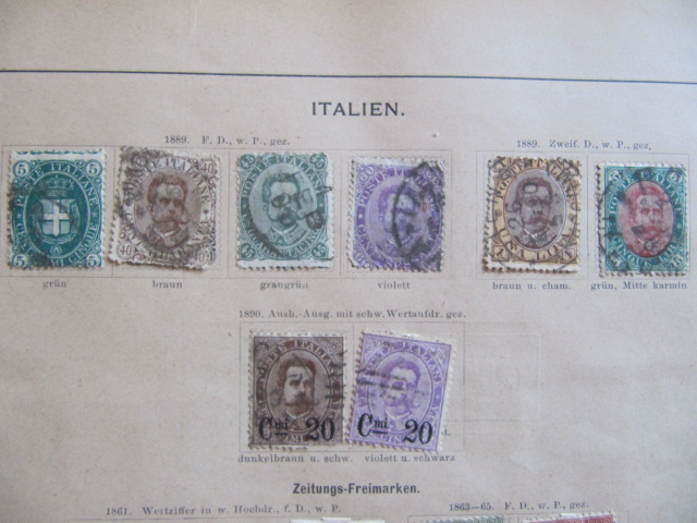 bei den Italienmarken ist nur die ganz linke, grün-rote, als Wertvoll zu bezeichnen, steht mit 600€ im Katalog, dann noch die 20c auf 50c mit 35€ Michel un die 60C violett mit 15€.