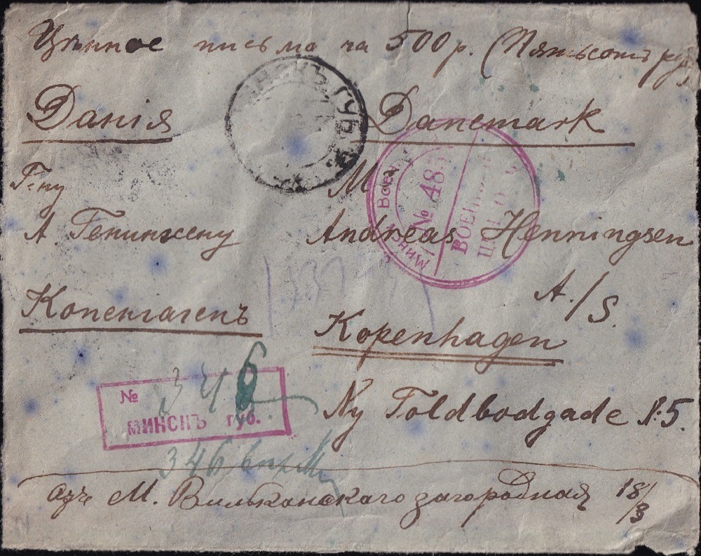 Geldbrief über 500 Rubel von Minsk nach Kopenhagen. Vorderseitig befindet sich der Typ 41, rückseitig der Typ 35 auf dem Brief. Hier sind auch vorschriftsmäßig fünf Siegel des Postamtes, die super erhalten sind.