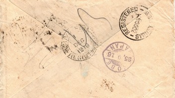 • Russland Zensur, eingeschr. Brief nach Suva, Fiji-Islands, 1916, Rückseite.jpg
