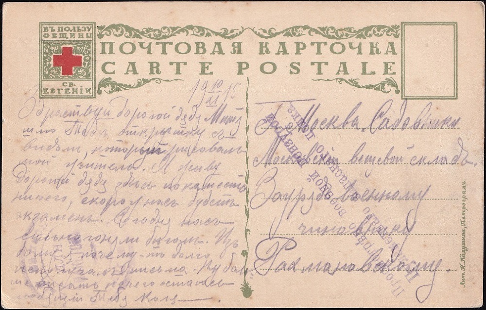 Postkarte vom 21.10.1915 nach Moskau. Der Einheitenstempel unten links ist leider nicht lesbar, der Zensurstempel dafür sehr klar: Geprüft Militärzensur - MG-Schützen-Reserve-Regiment (?). Hoffe, es ist richtig übersetzt.