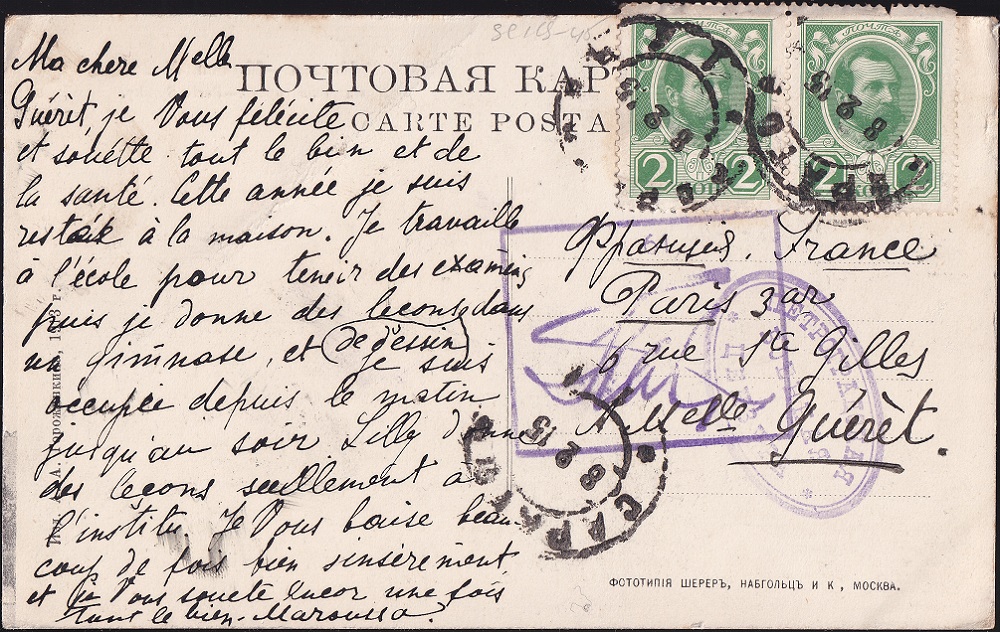 Portogerecht frankierte Ansichtskarte (Kremlmauer mit Spasski-Tor), gesendet aus Saratow (8.2.1915) nach Paris. Geprüft wurde in Petrograd. Zensurstempel sind der Typ 3 und der Typ 7. Vom Typ 7 gibt es die Zensornummern bis '68', von denen Speeckaert 47 Stück (inklusive Nachträge listet). Hier zeige ich die Nr. '61', die nicht aufgeführt ist.