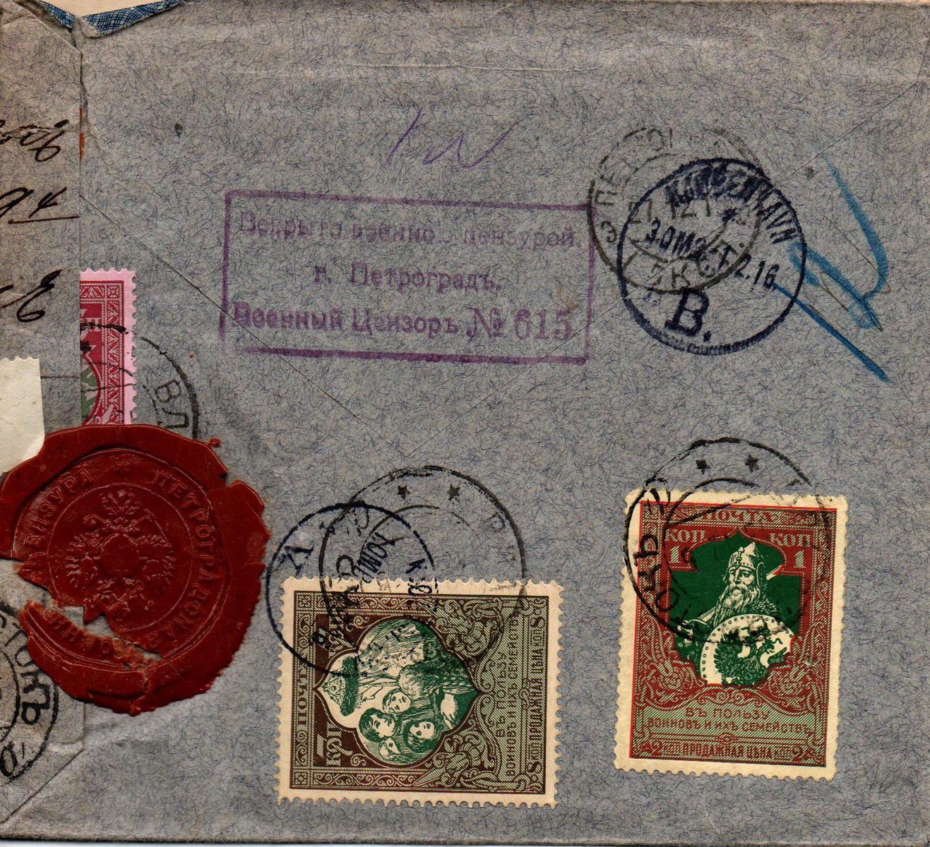 Der Poststempel Petrograd stammt wohl vom 27.12.15 ((jul. Kalender) der Ankunftstempel Kopenhagen vom 1.2.16.