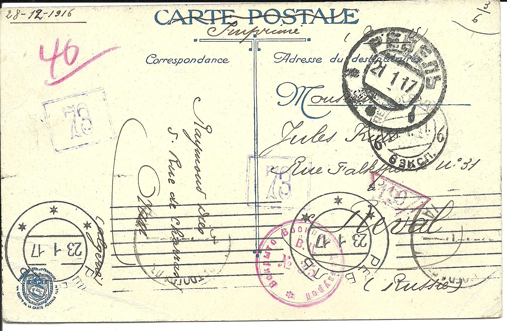 Aufgeben wurde die Karte in Oran vermutlich am 28.12.1916, s. handschriftlicher Vermerk auf der Anschriftenseite; die Frankatur in Form einer französischen 5 Centimes-Marke sowie ein unvollständig abgeschlagener TSt von Oran befinden sich auf der Bildseite.Den Transit durch Petrograd dokumentieren ein unleserlicher Maschinenstempel der Stadtpostexpedition und ein kleinformatiger Handstempel der 6. Expedition des Petrogrades Postamtes vom 10.01.1917.