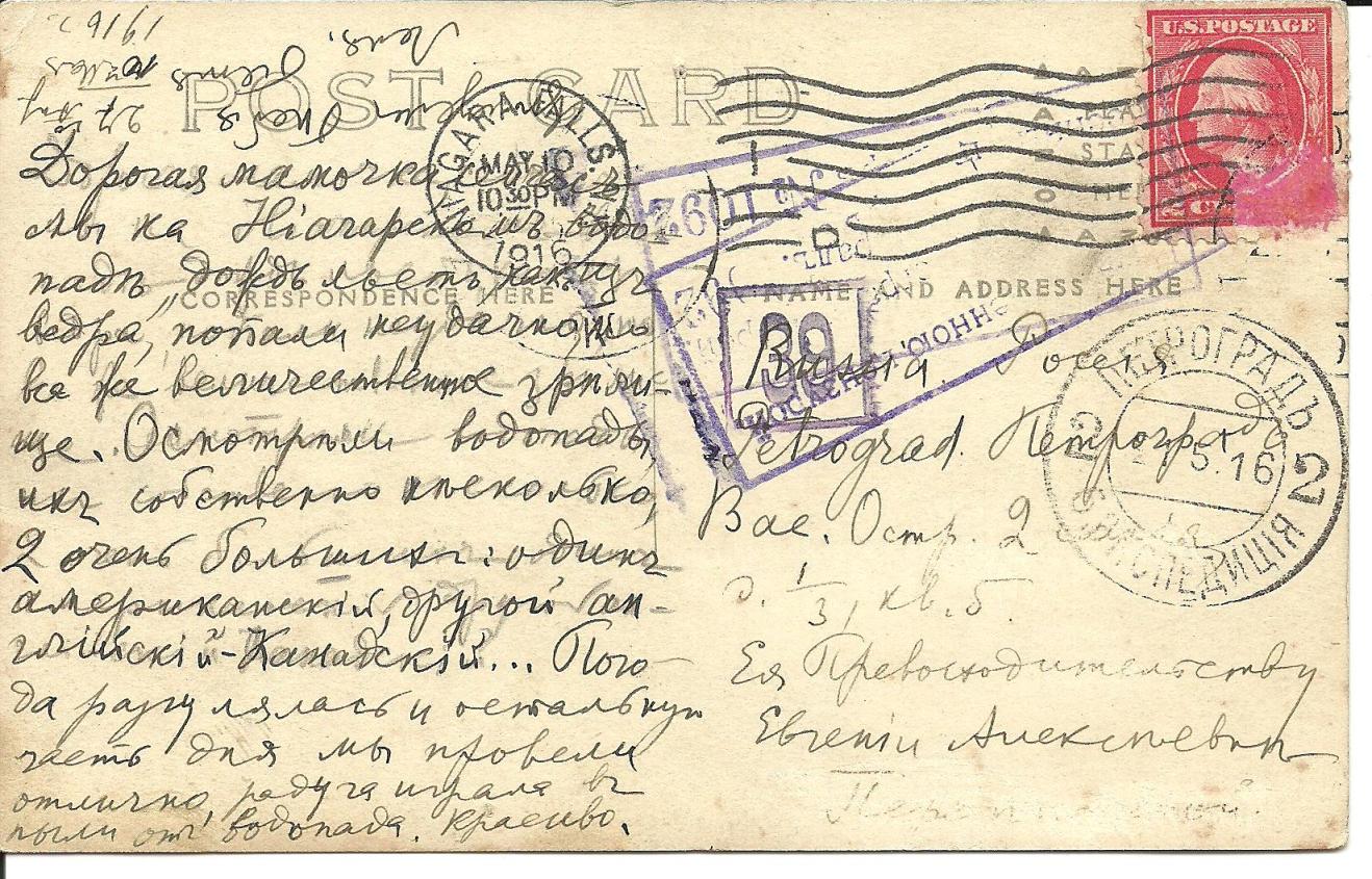 „Sortierstempel“ in meinem Bestand hat auch jedes Mal ein zusätzlicher postalischer Bearbeitungsschritt im Petrograder Postamt stattgefunden: Weiterleitung der Sendung im Transit (z.B. Ausland – Reval via Petrograd, Zensur in Petrograd), Übersetzung der nicht in Russisch verfassten Anschrift (Ausland – Petrograd).Bei der von mir heute gezeigten Karte aus dem Mai 1916 von den Niagarafällen nach Petrograd wurde der Sortierstempel mit der Nr. 39 aufgebracht und ein rechteckiger Stempel der Petrograder Militärzensur mit der Nr. 1092 doppelt abgeschlagen. Es sieht so aus, das die Reihenfolge der Abschläge Rechteckstempel – Nummernstempel –Rechteckstempel war. Vielleicht hängt es damit zusammen, dass ein Teil des Textes mit Bleistift vorgeschrieben und dann mit Tinte überschrieben wurde und deshalb einer nochmaligen Kontrolle unterzogen wurde.
